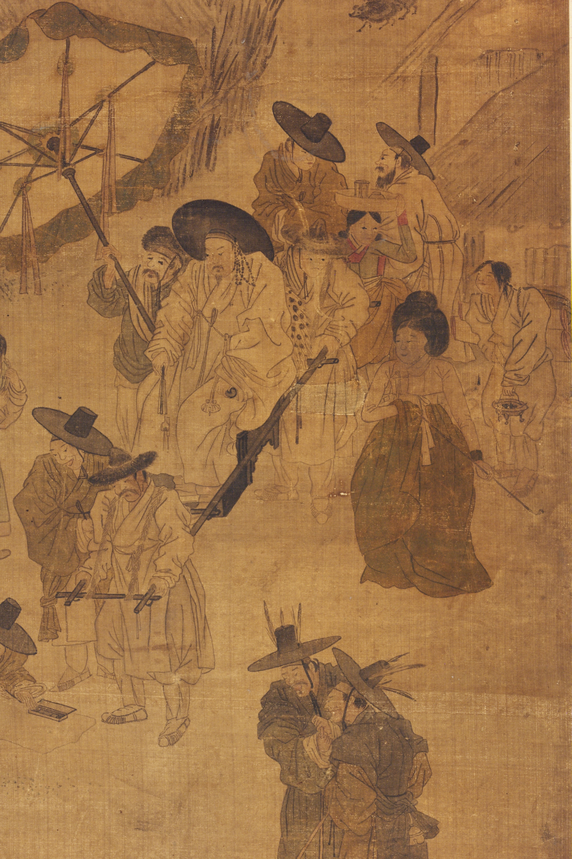 이 작품은 단원 김홍도의 전성기인 30대 때 그린 작품으로 추정되며 조선 후기 당시 과거제도의 폐해를 풍자하며 그린 작품이라고 합니다. '공원춘효도'는 과거시험장에 복잡하게 얽혀있는 우산(일산)들을 회화적이고 아름답게 표현되었고 그 속에 있는 인물들의 다양한 모습들을 드라마틱 하게 담은 작품으로 작품에 대한 해설을 들어보시면 상당히 재밌는 부분이 많습니다.