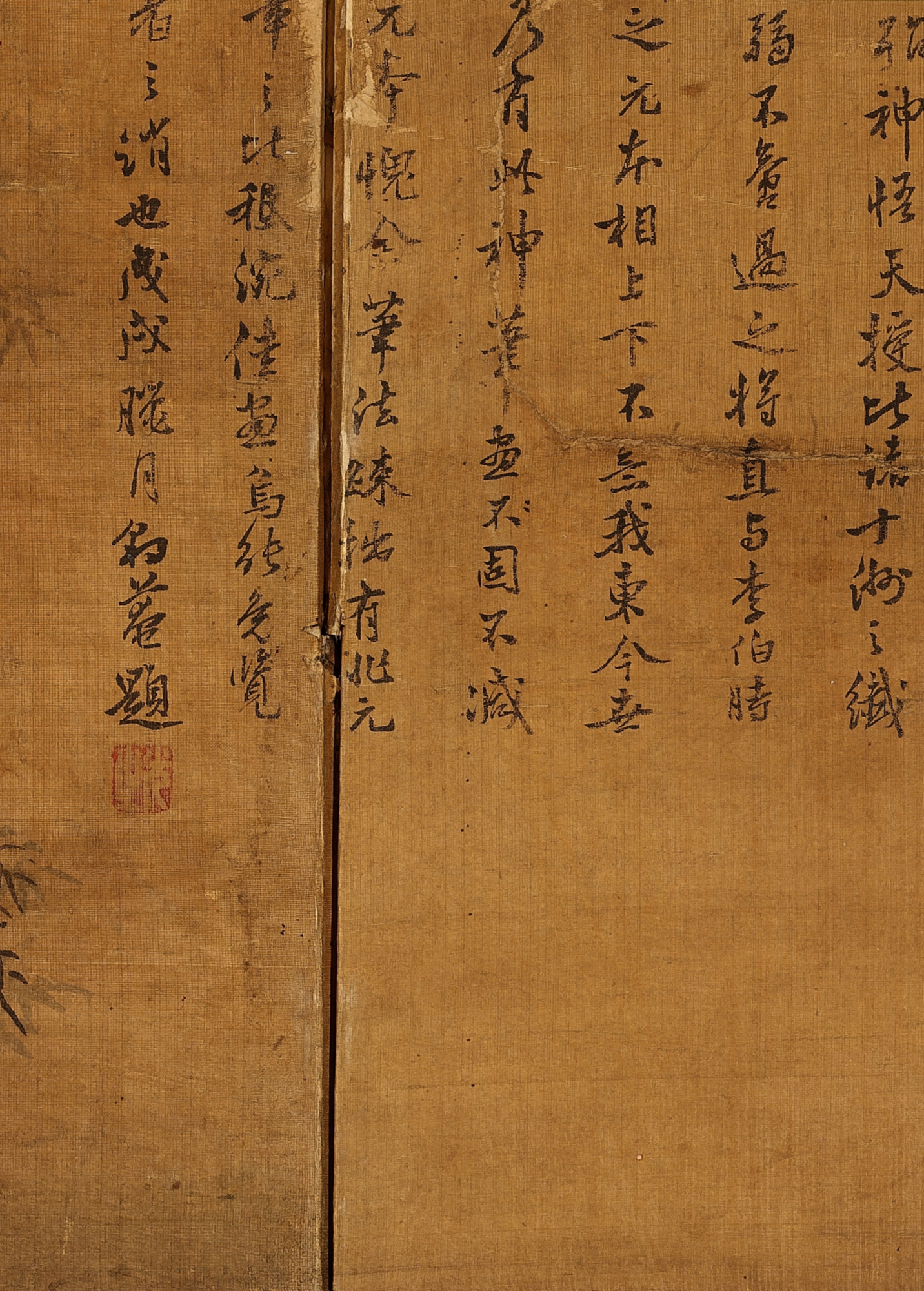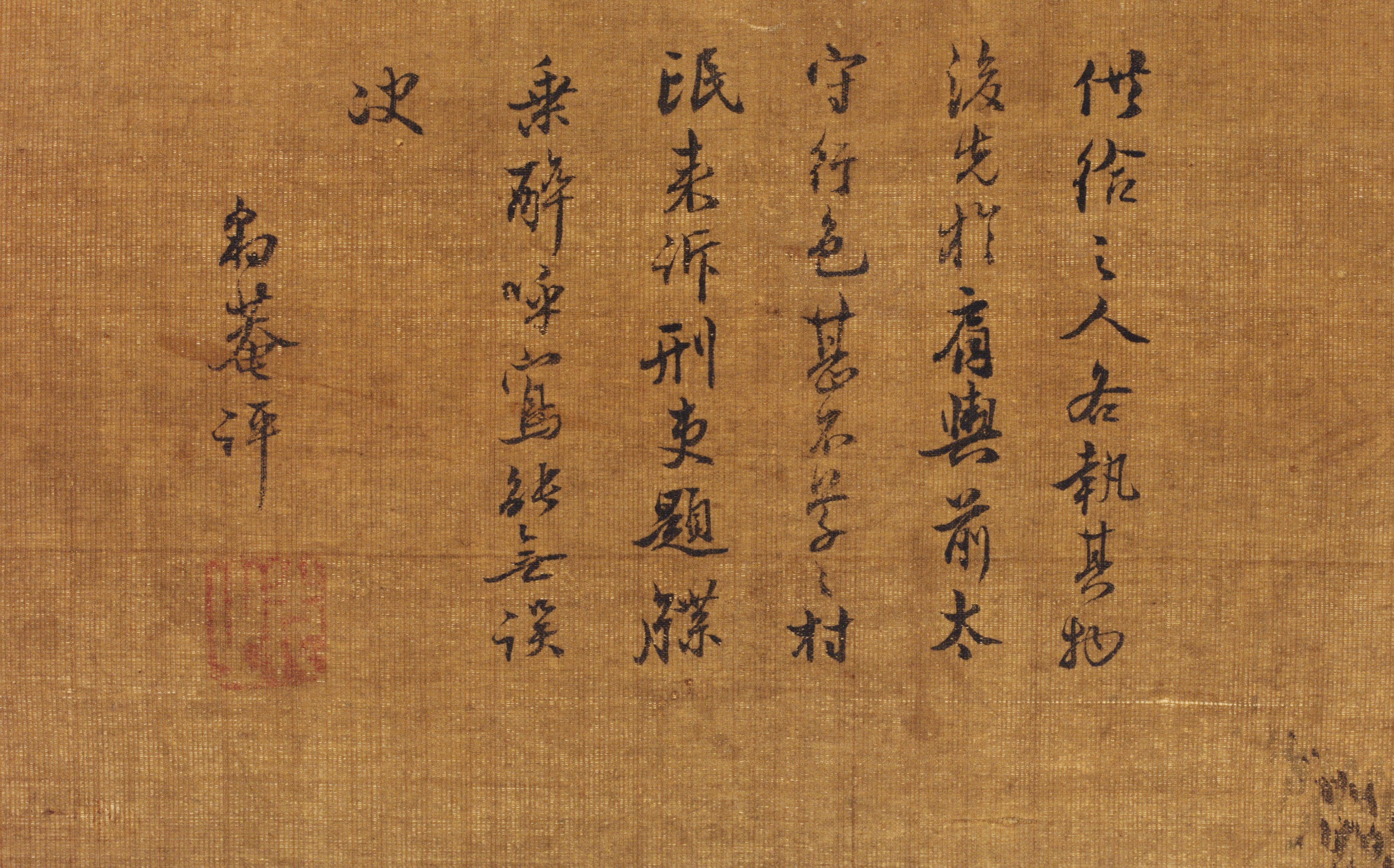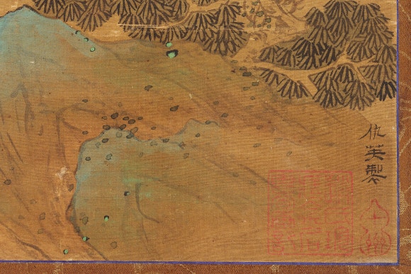 화면 오른쪽 아래에 ″구영제(仇英製)″라는 관서(款署)가 있으며 위의 별지(別紙)에는 동기창(董其昌, 1555-1637)과 진계유(陳繼儒, 1558-1639)의 제발(題跋: 책이나 그림에 그 유래나 펴내는 뜻, 감상, 비평 등을 적은 글)과 낙관(落款)이 있어 구영(仇英)의 작품으로 전해진다.