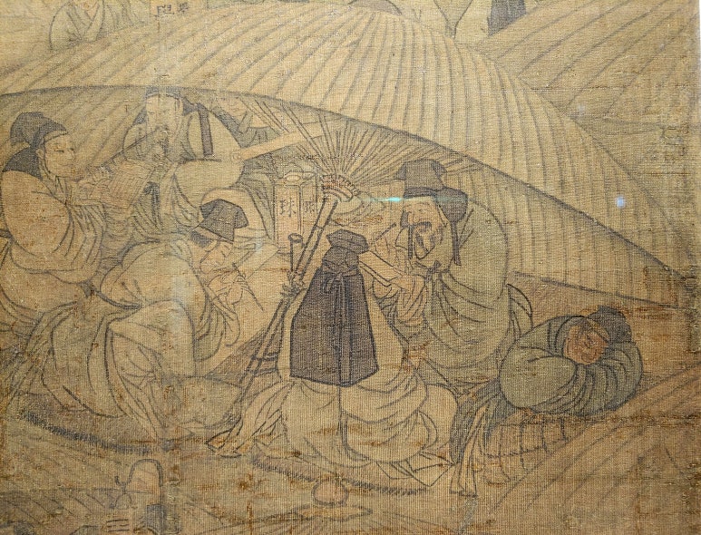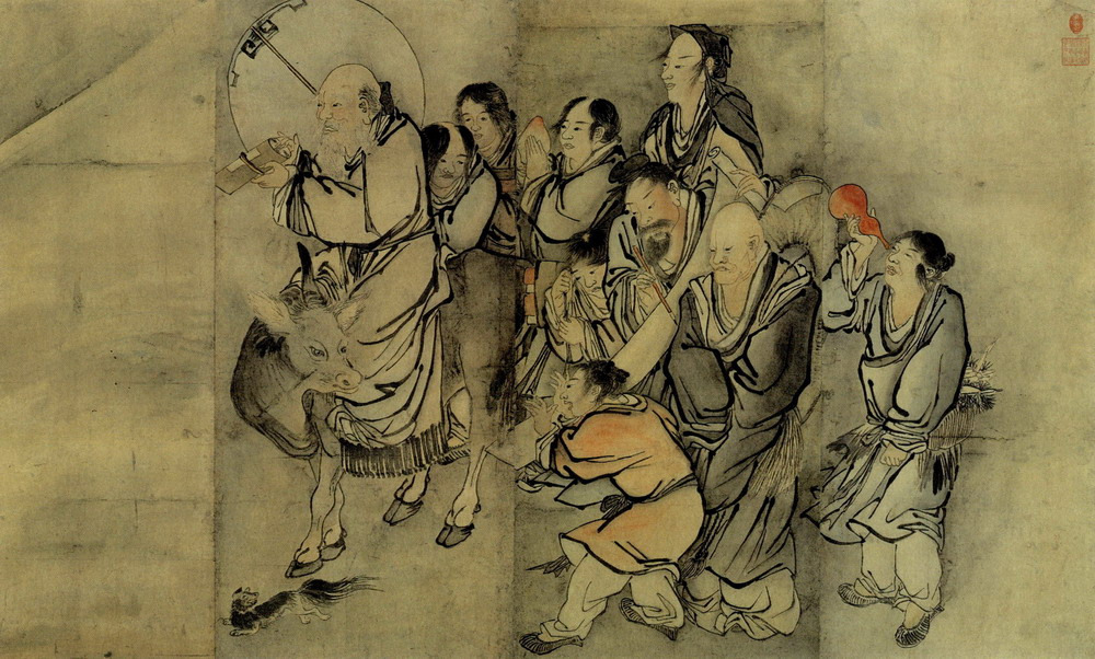 맨뒤쪽의 무리에는 외뿔소를 타고 「도덕경(道德經)」을 들고 있는 노자(老子)가 있고,