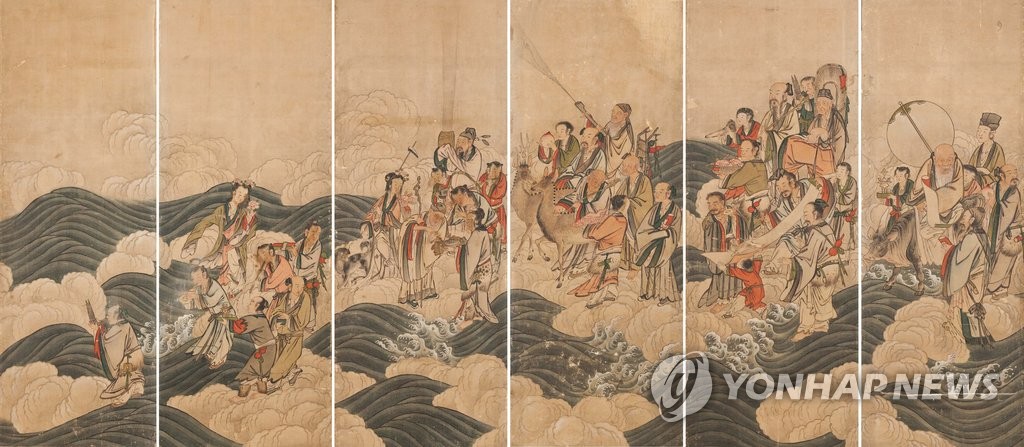 <바다위의 신선들(해상군선도 海上群仙圖)>는 도교에 나오는 신선 19명을 조선옷 입은 신선으로 그린 그림이다.