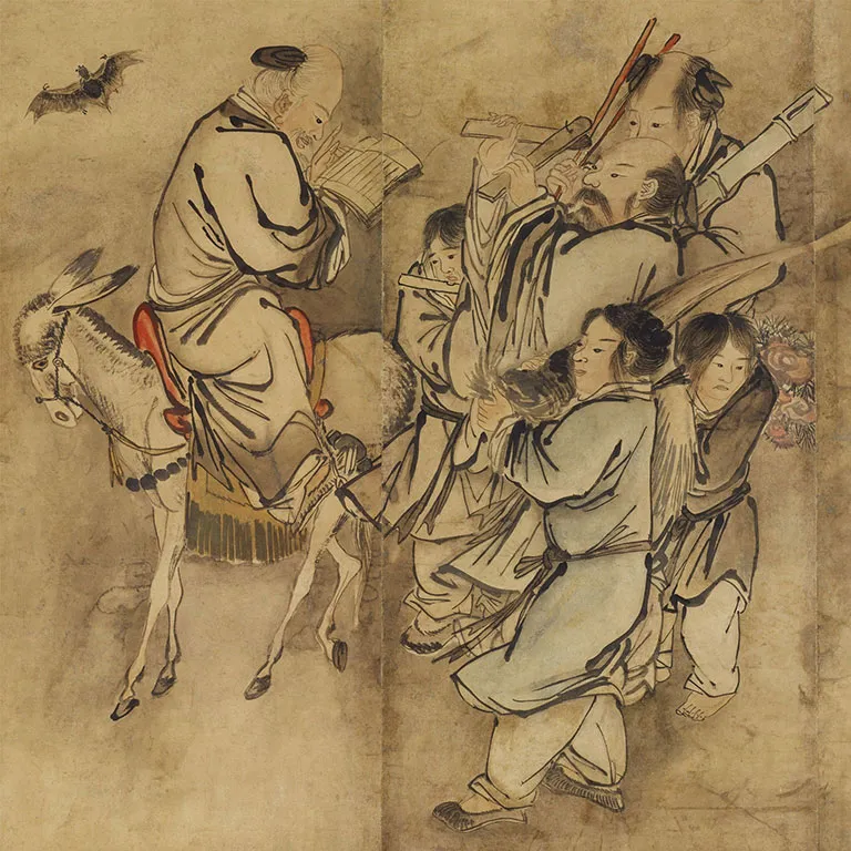 그 뒤로 흰당나귀를 거꾸로 타고 책을 보고 있는 장과로(張果老) (이 당나귀는 평소에는 종이처럼 접어서 들고 다닌단다),